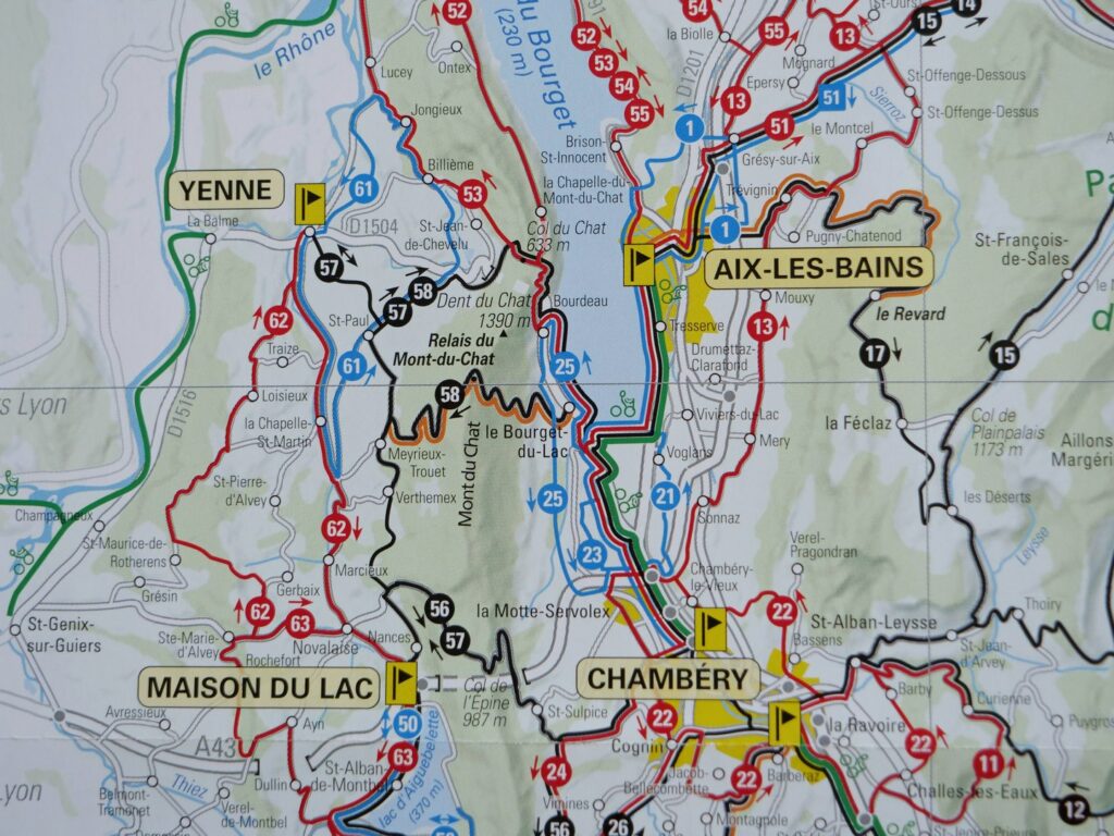 – Le tour du Lac du Bourget (51km – itinéraire rouge) : si vous souhaitez faire une balade avec les plus beaux points de vues qui sont autour du lac cet itinéraire est fait pour vous. Il vous fera passer par les plus belles plages, par le belvédère de la montée du Col du Chat, par les différents ports, par le belvédère d’Ontex…